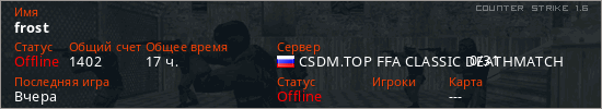 Играет на Counter Strike 1.6 сервере. Страна: РоссияПервый раз замечен 01:45 16.09.2021