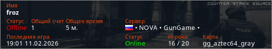 Играет на Counter Strike Source сервере. Страна: РоссияПервый раз замечен 18:52 11.02.2026