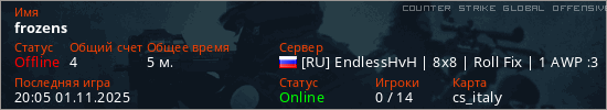 Играет на Counter Strike Global Offensive сервере. Страна: РоссияПервый раз замечен 19:44 01.11.2025