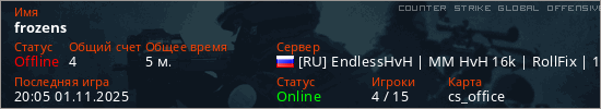 Играет на Counter Strike Global Offensive сервере. Страна: РоссияПервый раз замечен 19:44 01.11.2025