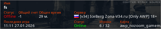 Играет на Counter Strike Source сервере. Страна: РоссияПервый раз замечен 12:09 26.01.2026