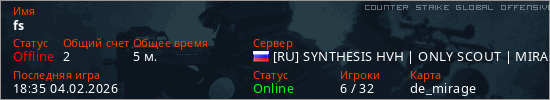 Играет на Counter Strike Global Offensive сервере. Страна: РоссияПервый раз замечен 18:26 04.02.2026