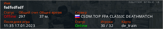 Играет на Counter Strike 1.6 сервере. Страна: РоссияПервый раз замечен 14:26 15.01.2023
