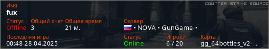Играет на Counter Strike Source сервере. Страна: РоссияПервый раз замечен 01:41 04.05.2024