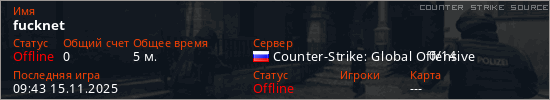 Играет на Counter Strike Source сервере. Страна: РоссияПервый раз замечен 09:32 15.11.2025