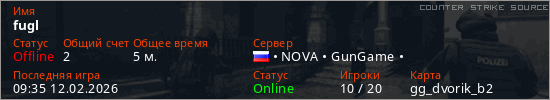 Играет на Counter Strike Source сервере. Страна: РоссияПервый раз замечен 09:32 12.02.2026