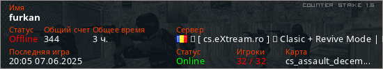 Играет на Counter Strike 1.6 сервере. Страна: РумынияПервый раз замечен 21:40 15.12.2024