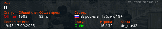 Играет на Counter Strike 1.6 сервере. Страна: РоссияПервый раз замечен 11:50 27.11.2021
