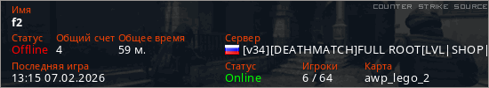 Играет на Counter Strike Source сервере. Страна: РоссияПервый раз замечен 12:14 07.02.2026