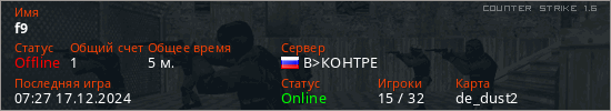 Играет на Counter Strike 1.6 сервере. Страна: РоссияПервый раз замечен 07:15 17.12.2024