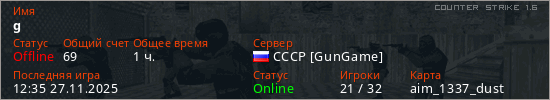 Играет на Counter Strike 1.6 сервере. Страна: РоссияПервый раз замечен 15:18 29.10.2023