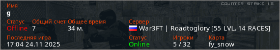 Играет на Counter Strike 1.6 сервере. Страна: РоссияПервый раз замечен 06:43 12.10.2021