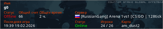 Играет на Counter Strike Global Offensive сервере. Страна: РоссияПервый раз замечен 17:30 02.02.2026