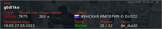 Играет на Counter Strike 1.6 сервере. Страна: РоссияПервый раз замечен 10:51 05.08.2021