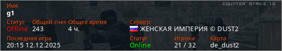 Играет на Counter Strike 1.6 сервере. Страна: РоссияПервый раз замечен 00:42 06.06.2025
