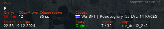 Играет на Counter Strike 1.6 сервере. Страна: РоссияПервый раз замечен 19:48 27.10.2022