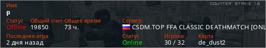 Играет на Counter Strike 1.6 сервере. Страна: РоссияПервый раз замечен 20:07 11.09.2021