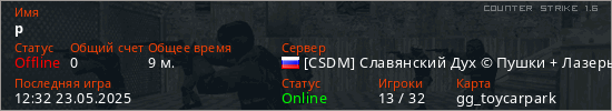 Играет на Counter Strike 1.6 сервере. Страна: РоссияПервый раз замечен 19:45 29.04.2025