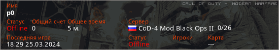 Играет на Call of Duty 4: Modern Warfare сервере. Страна: РоссияПервый раз замечен 18:25 25.03.2024