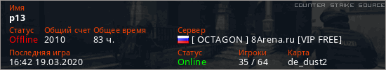 Играет на Counter Strike Source сервере. Страна: РоссияПервый раз замечен 18:05 15.01.2020