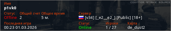 Играет на Counter Strike Source сервере. Страна: РоссияПервый раз замечен 00:11 01.03.2026