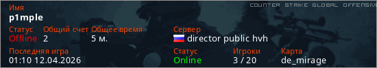 Играет на Counter Strike Global Offensive сервере. Страна: РоссияПервый раз замечен 00:24 12.04.2026