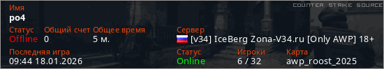 Играет на Counter Strike Source сервере. Страна: РоссияПервый раз замечен 09:42 18.01.2026