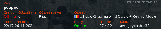 Играет на Counter Strike 1.6 сервере. Страна: РумынияПервый раз замечен 14:31 06.11.2024