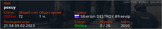 Играет на Counter Strike Source сервере. Страна: РоссияПервый раз замечен 18:04 02.02.2023