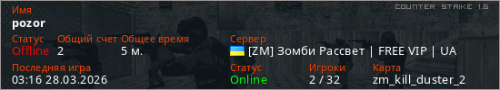 Играет на Counter Strike 1.6 сервере. Страна: УкраинаПервый раз замечен 03:10 28.03.2026