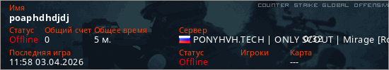Играет на Counter Strike Global Offensive сервере. Страна: РоссияПервый раз замечен 11:40 03.04.2026