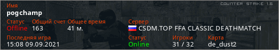Играет на Counter Strike 1.6 сервере. Страна: РоссияПервый раз замечен 21:53 08.09.2021