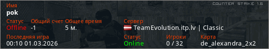 Играет на Counter Strike 1.6 сервере. Страна: ЛатвияПервый раз замечен 23:47 28.02.2026