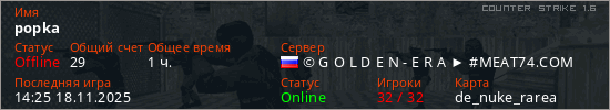 Играет на Counter Strike 1.6 сервере. Страна: РоссияПервый раз замечен 03:53 15.01.2023