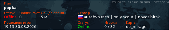 Играет на Counter Strike Global Offensive сервере. Страна: РоссияПервый раз замечен 18:48 30.03.2026