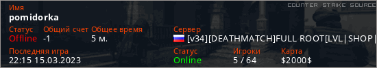 Играет на Counter Strike Source сервере. Страна: РоссияПервый раз замечен 22:13 15.03.2023