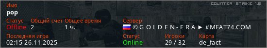 Играет на Counter Strike 1.6 сервере. Страна: РоссияПервый раз замечен 01:56 17.04.2023