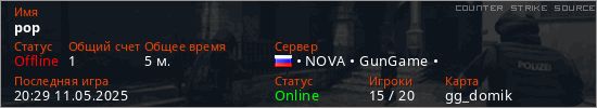 Играет на Counter Strike Source сервере. Страна: РоссияПервый раз замечен 20:25 11.05.2025