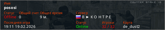 Играет на Counter Strike 1.6 сервере. Страна: РоссияПервый раз замечен 01:34 19.02.2026