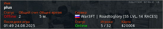 Играет на Counter Strike 1.6 сервере. Страна: РоссияПервый раз замечен 01:46 24.08.2025