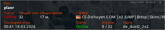 Играет на Counter Strike 1.6 сервере. Страна: ГерманияПервый раз замечен 02:41 09.03.2026