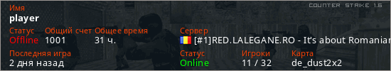Играет на Counter Strike 1.6 сервере. Страна: РумынияПервый раз замечен 14:29 01.07.2022