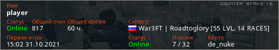 Играет на Counter Strike 1.6 сервере. Страна: РоссияПервый раз замечен 15:02 31.10.2021