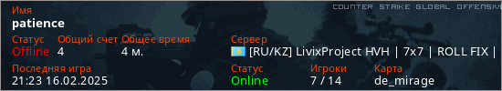 Играет на Counter Strike Global Offensive сервере. Страна: КазахстанПервый раз замечен 21:19 16.02.2025