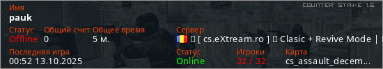 Играет на Counter Strike 1.6 сервере. Страна: РумынияПервый раз замечен 00:31 13.10.2025