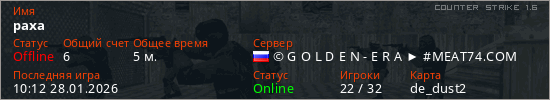 Играет на Counter Strike 1.6 сервере. Страна: РоссияПервый раз замечен 09:50 28.01.2026