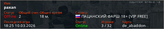 Играет на Counter Strike 1.6 сервере. Страна: РоссияПервый раз замечен 13:03 08.03.2026