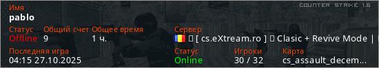 Играет на Counter Strike 1.6 сервере. Страна: РумынияПервый раз замечен 06:18 30.10.2024
