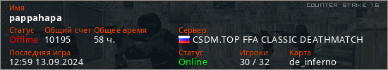 Играет на Counter Strike 1.6 сервере. Страна: РоссияПервый раз замечен 15:21 15.11.2019