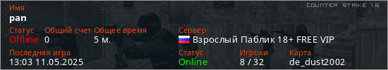 Играет на Counter Strike 1.6 сервере. Страна: РоссияПервый раз замечен 13:01 11.05.2025